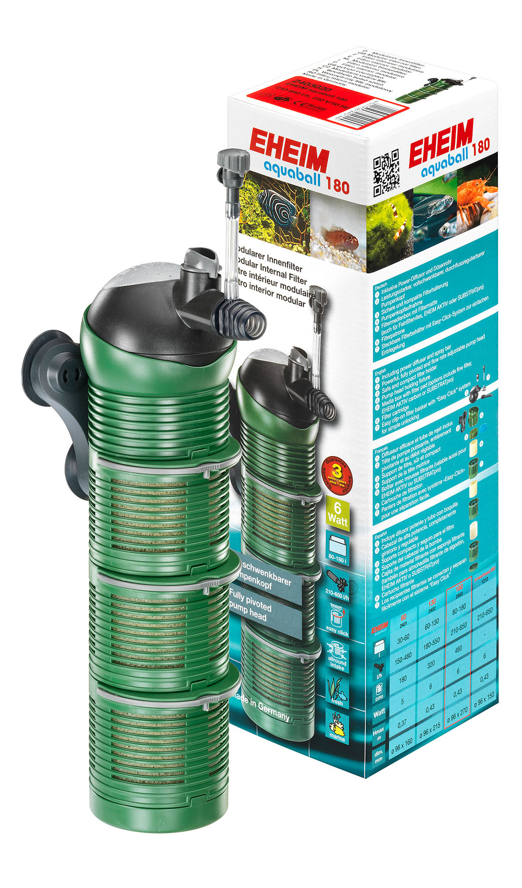 Eheim Innenfilter aquaball 180. media+. Dieser Innenfilter ist geeignet für Aquarien von ca. 80 bis 180 Liter mit einer Leistung von 210 bis 650l/h. 6W, Masse: 9.6x27cm