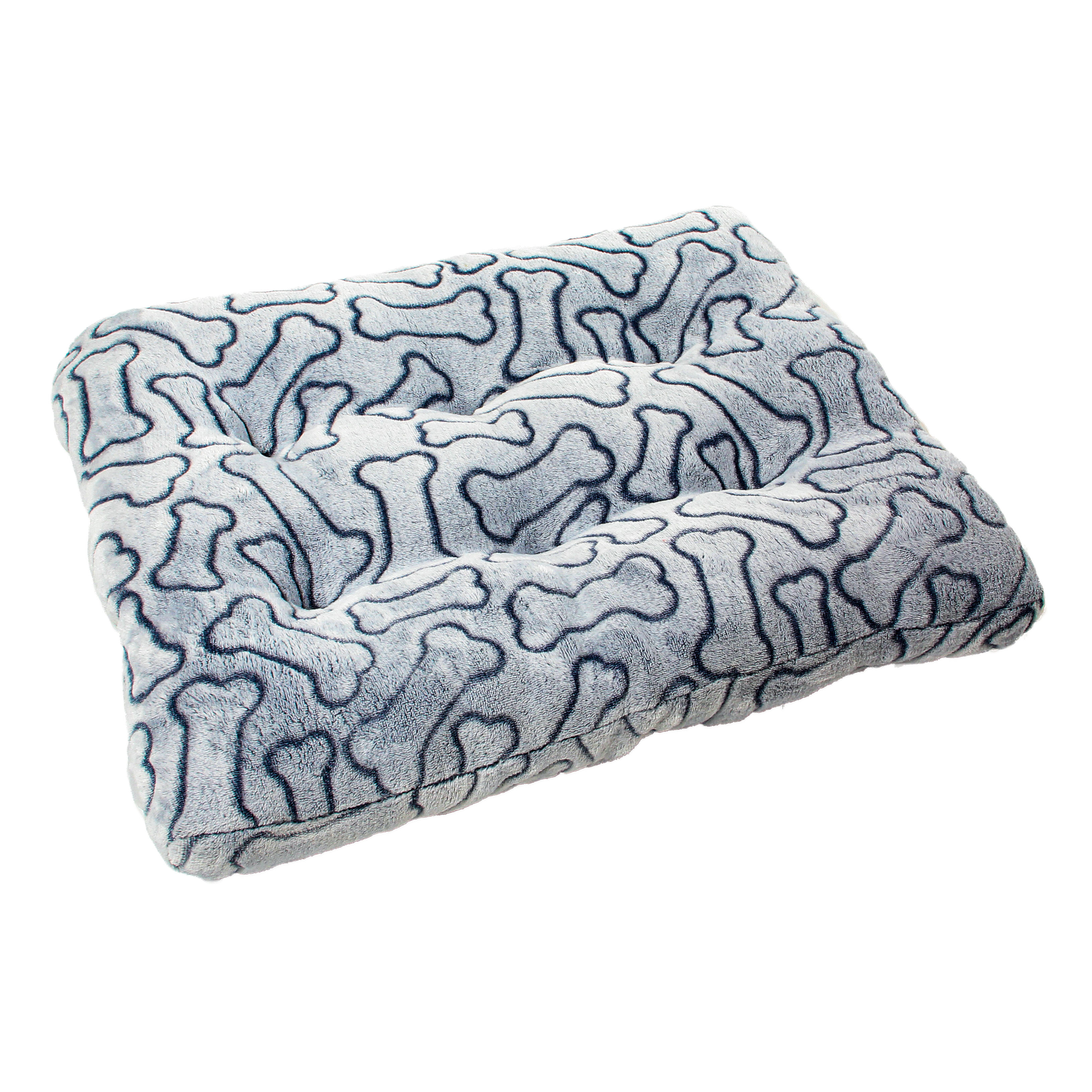 Aus grau-blauem Plüsch mit blauen Knochenmotiven, Anti-Slip, waschbar bei 30°C.