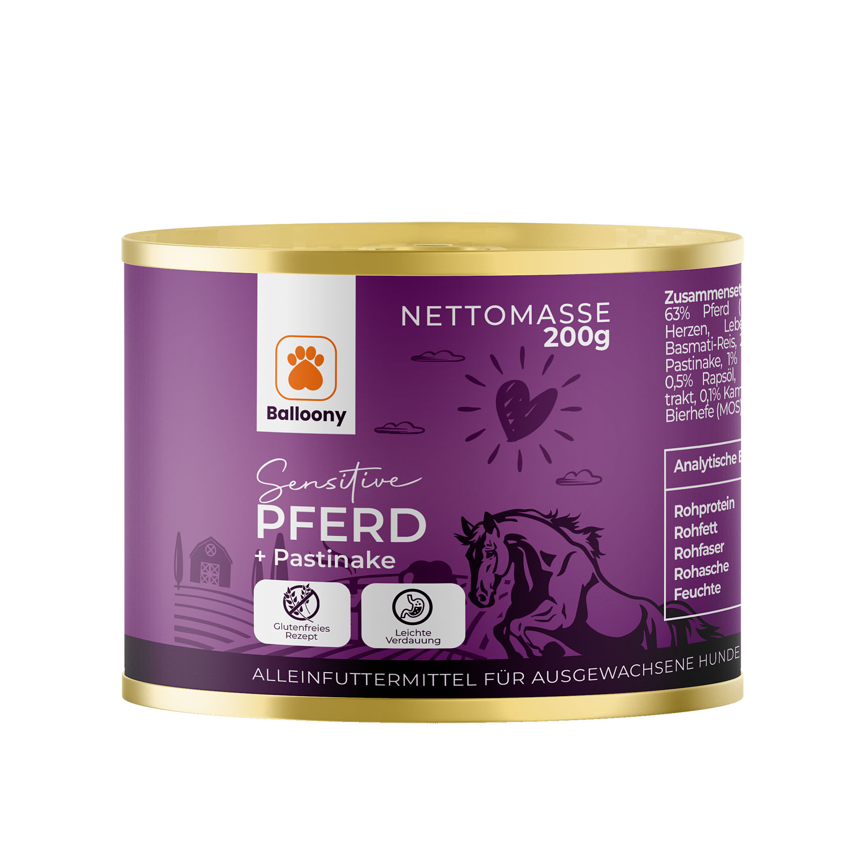 Découvre notre nourriture humide premium pour chiens au cheval, enrichie de moules aux orles verts, de MOS, d'inuline ainsi que de courge et de carotte pour un soin optimal des intestins. Cette nourriture soutient la flore intestinale et la digestion de ton chien, ainsi que le sentiment général de joie de ton compagnon à quatre pattes. Parfait pour l'alimentation des chiens sensibles, il offre une solution naturelle contre les problèmes digestifs. Nourris ton chien pour une vie longue et heureuse avec notre nourriture humide savoureuse et riche en nutriments.
