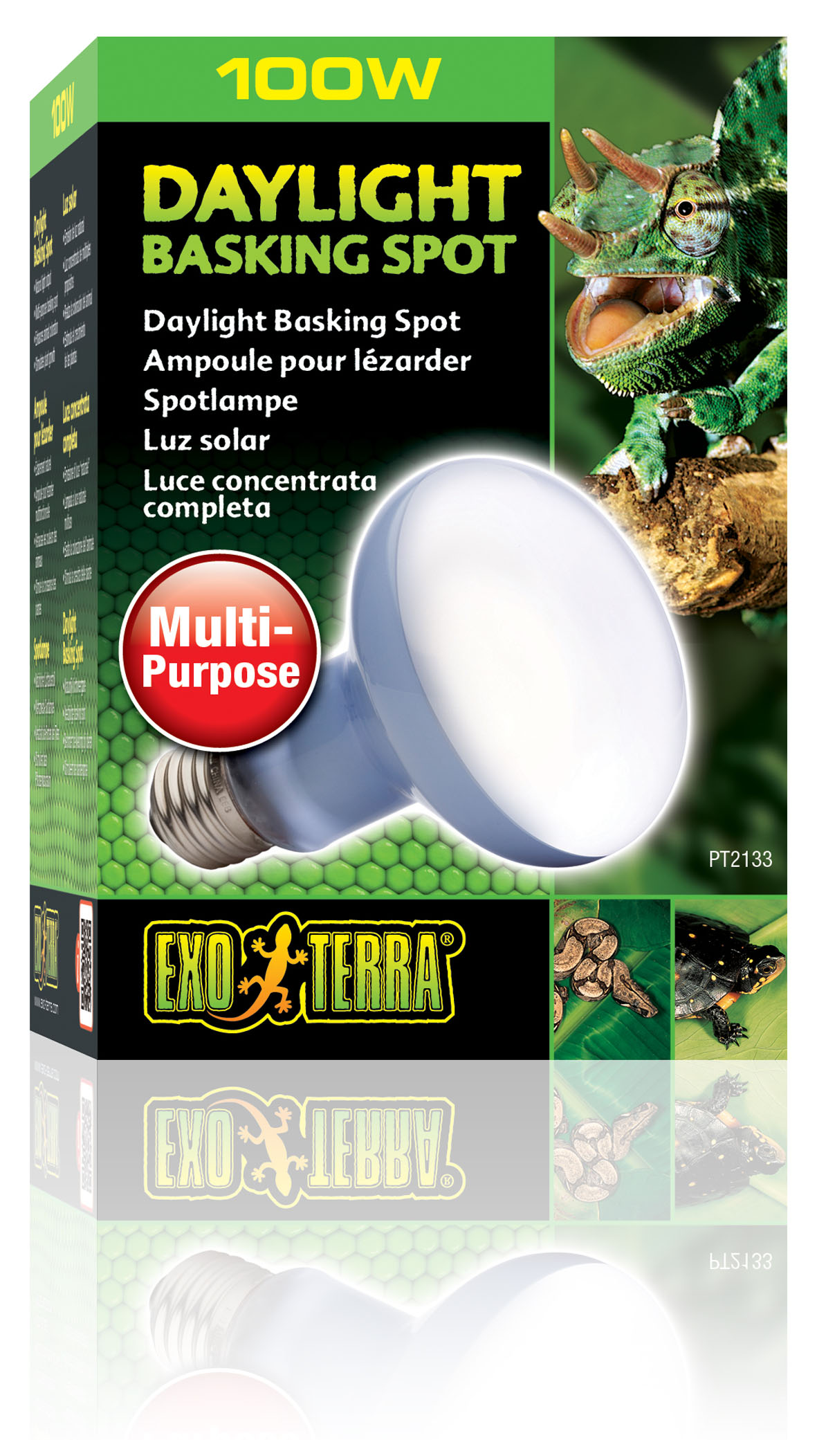 Ampoule à large spectre reproduisant la lumière du jour, avec manchon de néodyme. Le spectre est idéal pour la photosynthèse des plantes et les rayons UVA (ultraviolets A) contribuent au bien-être physiologique des reptiles. Cette ampoule permet de diriger la chaleur et la lumière dans une certaine direction, afin de créer des sites pour lézarder dans le terrarium.